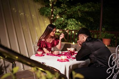 The setup includes a beautifully decorated outdoor canopy with fairy lights, flower petals, candles, personalized table setup.